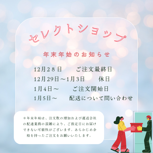 例年、年末にお荷物が増加する時期となりますため、配送に通常よりお時間が生じる場合がございます。