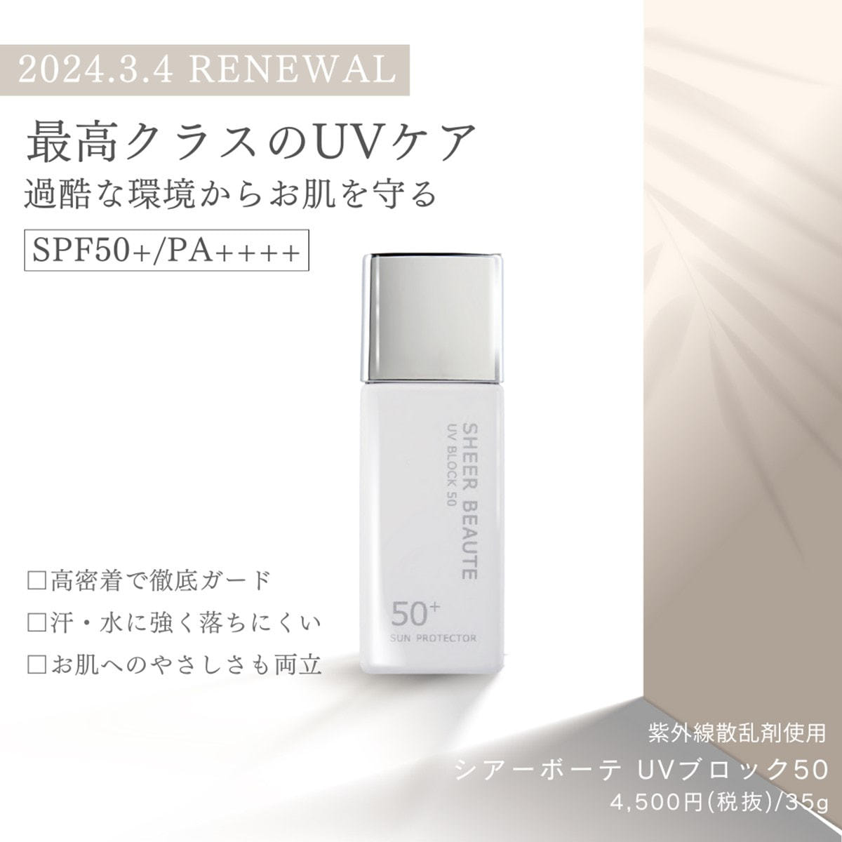 高いSPF/PA値特有の重く感じるような負担を軽減し、お肌にストレスを与えない処方で快適に過ごせます。