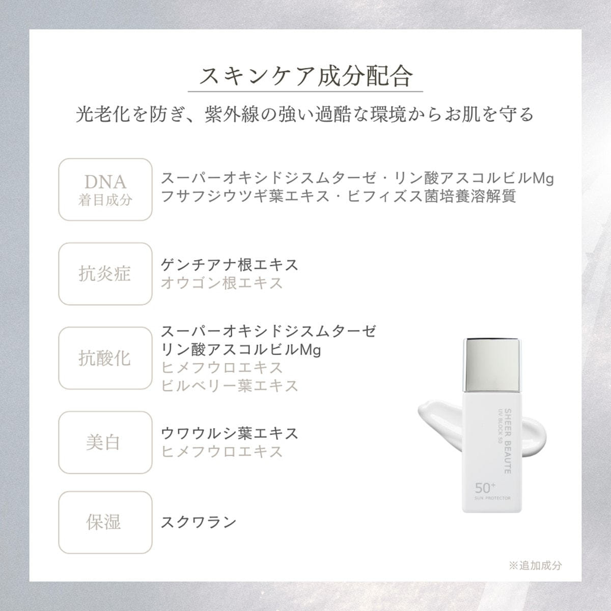 高い紫外線環境を考慮した美容成分を配合し、日中のお肌をトータルに守ります。